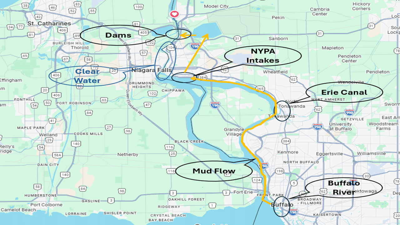 Downstream, that muddy water continues along the Robert Moses Parkway and eventually reaches the NYPA intakes. Those intakes pull in the dirty water, send it underground into the reservoir, and later release it through the dams—downstream of Devils Hole. That’s why the stretch from just above the intakes, over the Falls, and down to the dams stays clear, while everything below the dams turns muddy.